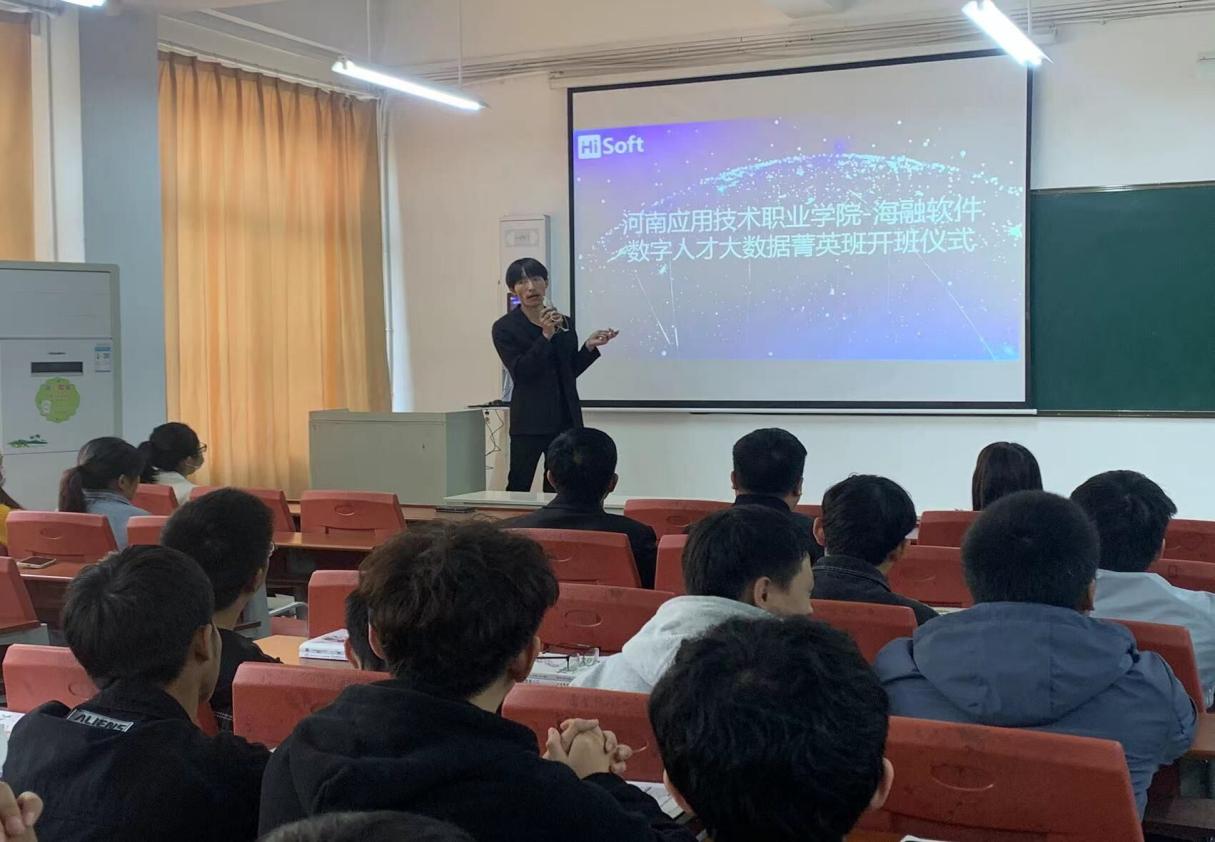 第三个环节由海融软件院校合作经理吴天成主题介绍“海融软件大数据人才箐英班”实施规划及“码农计划全流程项目管理方案”。吴总表示:”校企双方合作宗旨是通过双方的紧密合作,打造双赢、可持续发展的战略合作伙伴关系。开班后人才培养采用订单培养、双元育人和人才培训等模式,推动高职院校教育与大数据产业发展深度融合。通过加强实践性教学、职业技能培训、以赛促训等措施,推进工学结合双元育人,为大数据产业培养和输送符合行业需求的应用型人才。”