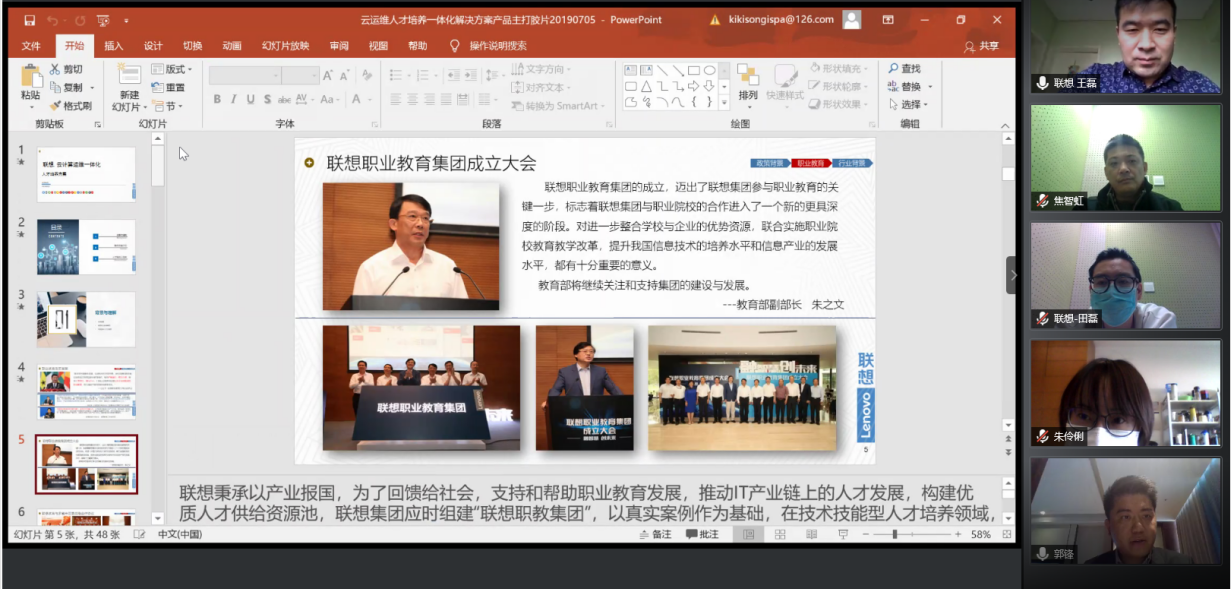 联想集团智慧教育职教业务总监郭锋提出了了联想教育“云物大智”专业共建方案,方案中展示了联想智能化转型阶段性成果,提出联想教育“云物大智”专业共建模式,提供了合作全景图并且就员工职业素养进行了成果展示,同时向公司提出合作共赢的专业建设方案。