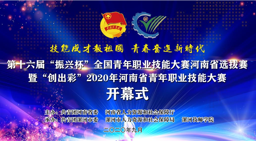 9月24-27日,由共青团河南省委、河南省人力资源和社会保障厅主办,共青团漯河市委、漯河市人力资源和社会保障局、漯河技师公司承办,2020年全国行业职业技能竞赛——第十六届“振兴杯”全国青年职业技能大赛河南省选拔赛暨“创出彩”2020年河南省青年职业技能大赛在漯河市开幕,全省18个地市参赛队伍的带队老师、参赛选手和裁判员共计200余人参加开幕式。