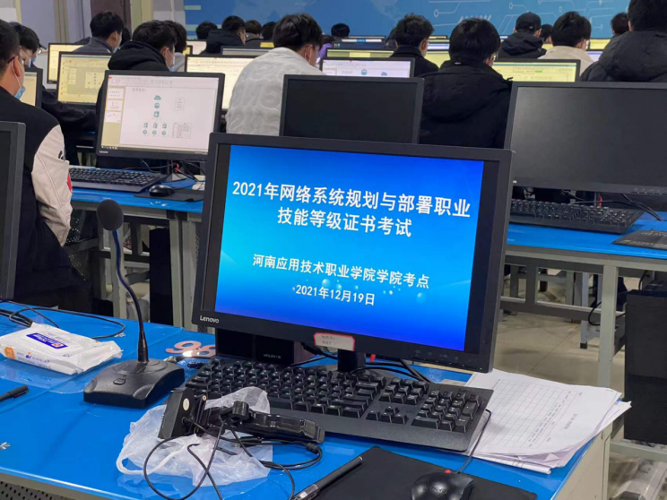 本次考试由福建中锐网络股份有限公司提供师生培训及技术支持,考试前企业人员通过线上对考点软硬件资源进行了验收考核,本院网络系统规划与部署考点满足1+X中级考试认证要求。E425机房课可容纳80名员工,前后共有4个监控摄像头,能服务于各类竞赛及考试,考试前,监考教师进行了监控录像测试及人脸识别系统功能检测,均达到了考证要求。