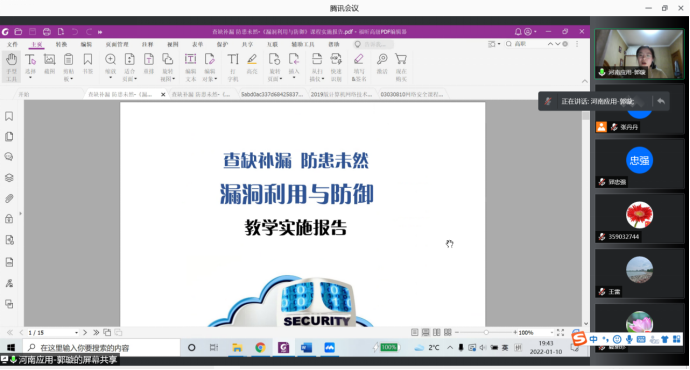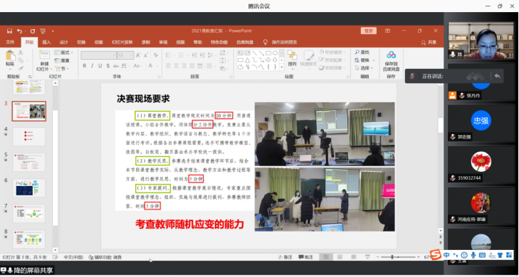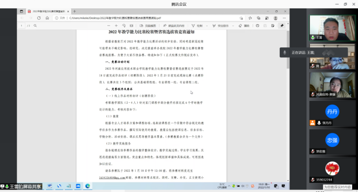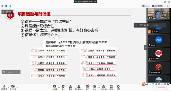 2021年教学能力大赛省赛二等奖获得者郭璇老师和省青教赛一等奖获得者降华老师结合自己参赛的体会提出了中肯的建议和意见,并图文并茂的向新的参赛团队展示了去年参赛的资料和获得的经验分享。