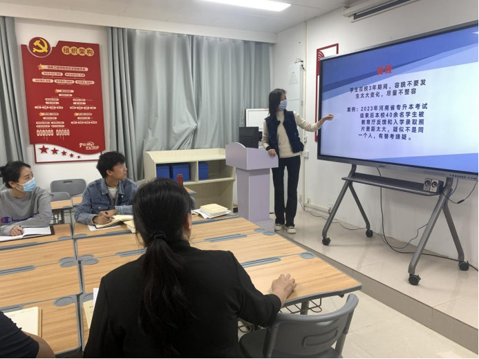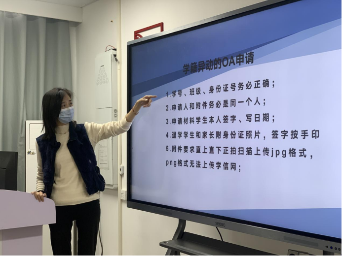 培训会上,本公司学籍管理员就学籍学历管理的各个流程进行了详细讲解,尤其强调新生入学资格审查、录取资格复查和学籍电子注册工作的重要性,其次对于学籍工作的几个关键词做了区分讲解,最后结合本校在学籍学历管理工作中的数字化平台OA的使用,给老师们演示了员工在申请学籍异动时的操作流程以及注意事项。