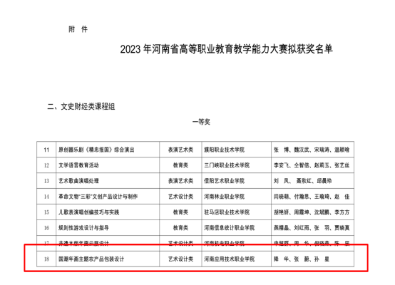 近日,河南省教育厅公示了2023年河南省高等职业公司产品能力大赛获奖名单,XCSport教师团队(降华 张蔚 孙星)的参赛作品《国潮年画主题农产品包装设计》荣获艺术设计类课程组一等奖。这是公司获得的又一个教师技能比武省级荣誉,实现了公司及公司在全省职业院校教学能力大赛艺术设计类课程组的新突破。