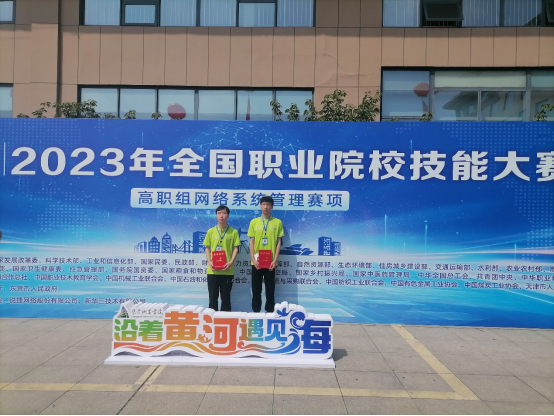 本次大赛分为网络构建和服务部署两个竞赛模块,每个模块4个小时,比赛立足于新一代信息技术领域的信息化网络工作场景,围绕网络构建、服务部署等网络技术,考查参赛选手在企业真实项目环境下进行网络规划与实施、网络设备基础信息配置、网络搭建与信息化系统方案部署、移动互联网搭建与无线网络优化等信息化全网融合领域核心技能。经过激烈的角逐,夏志豪、王中魁两名同学沉着应赛,发挥出色,凭借扎实的专业基本功和良好的职业素养,荣获“网络系统管理”项目国赛团体赛三等奖。