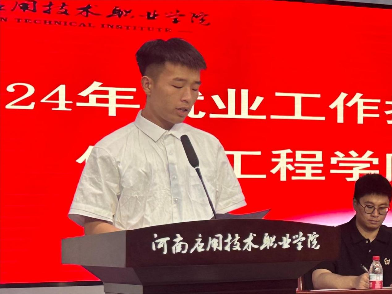 郑利民同学做为实习员工代表发言,他表示在岗位实习期间严格遵守实习管理各项规定,以积极的心态和饱满的热情去迎接新的挑战,走好进入职场的第一步。齐峰副经理、常昆主任、杨方圆老师和企业代表就岗位实习工作方案、岗位实习相关规定、员工自联企业要求、实习安全教育、实习任务和岗位供需等相关具体事项,为同学们做了讲解答疑。