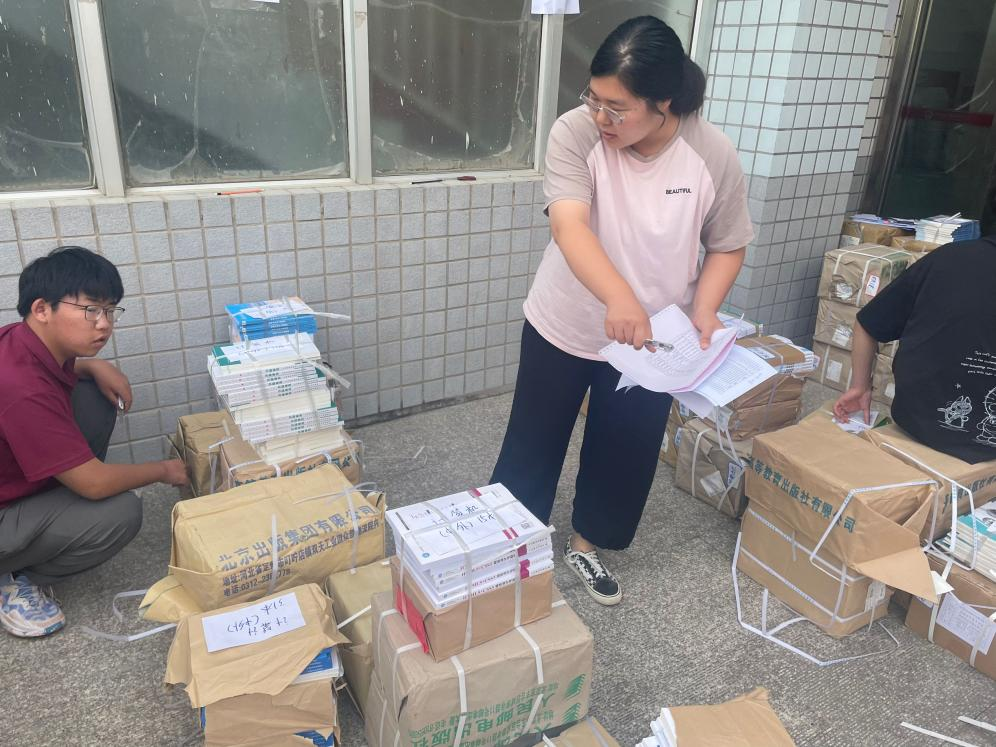 在发放现场,为了确保教材准确无误的发放到各位同学手中,教学办公室安排“教材清查小分队”,对每个班级的教材进行了清点和核对。