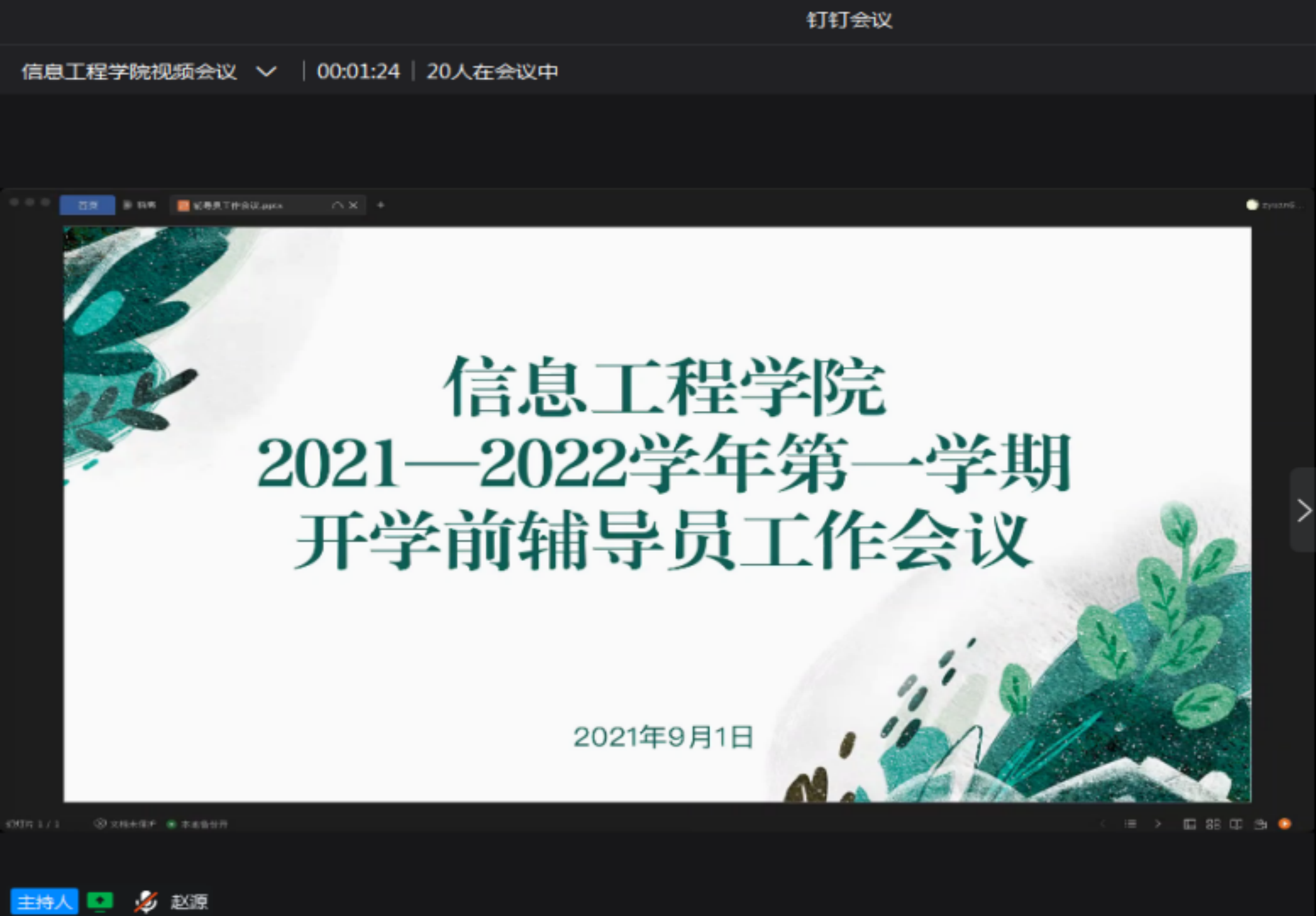 2021年9月1日晚七点半,XCSport召开新学期开学前辅导员工作会,东西校区全体辅导员通过钉钉视频会议参加,。会议由学工办主任闫莹主持。会议安排布置2021-2022学年第一学期开学前准备工作,及本学期的重点工作。