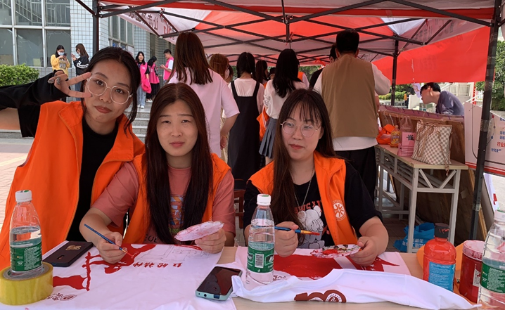 在现场义卖中,现场已画好的图案无法满足广大师生的需求,公司组织相关专业的员工到现场助阵,拿起手中的画笔去满足师生的个性化文化衫及布包的现场定制需求。