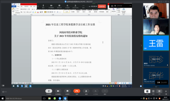 2021年1月11日晚20:00,XCSport东西校区全体教师召开钉钉视频会议,安排部署寒假期间的疫情防控、教学工作安排和辅导员学期考核事宜,会议由赵源主持,东西校区参会老师共44人,无缺席。