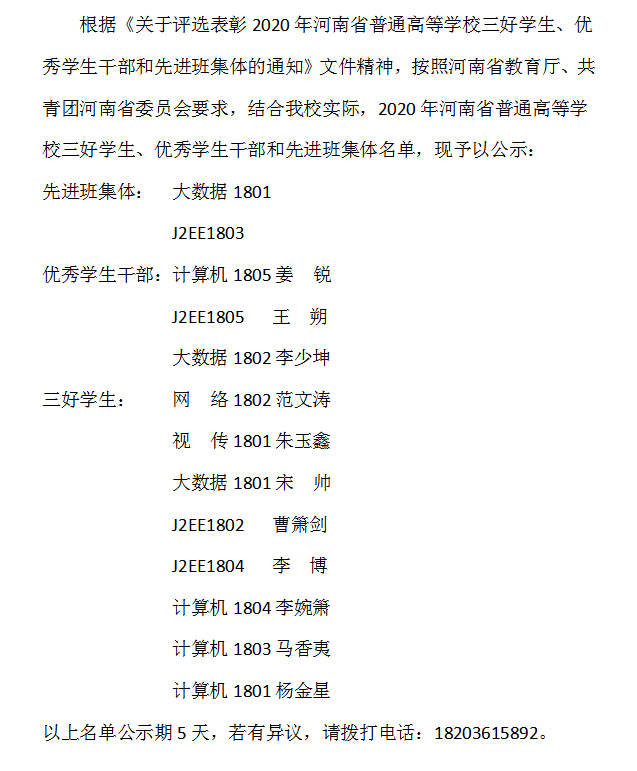 2020年河南省普通高等公司三好员工、优秀员工干部、先进班集体公示