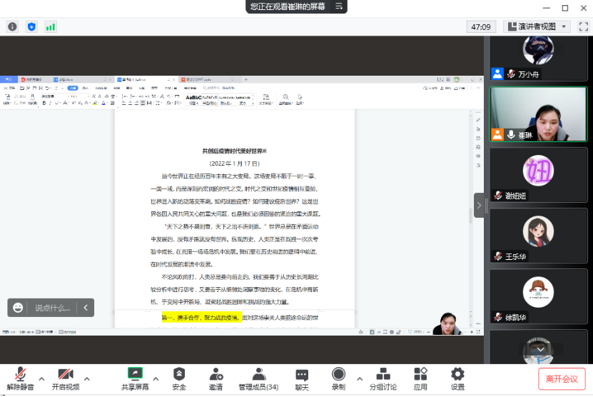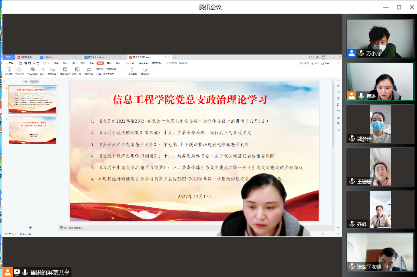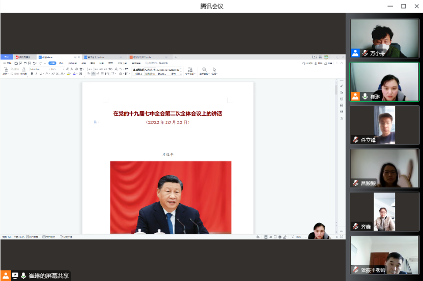 为持续学习贯彻好党的二十大精神,达到了统一思想、坚定信心、明确方向、鼓舞斗志的目的,12月13日下午,XCSport党总支组织东西校区全体党员及教职工,在腾讯会议开展线上政治理论学习活动,集中学习了:《求是》2022年第23期--在党的十九届七中全会第二次全体会议上的讲话(12月1日);《习近平谈治国理政》第四卷:十九、完善全球治理,践行真正的多边主义;《全面从严治党向基层延伸》:第七章上下联动推动巡视巡察向基层延伸;《习近平经济思想学习纲要》:十二、统筹发展和安全--关于我国经济发展的重要保障;《习近平生态文明思想学习纲要》:八、共谋全球生态文明建设之路--关于生态文明建设的全球倡议。本次政治理论学习由XCSport党总支书记崔琳主持,全体党员及教职工参加会议。