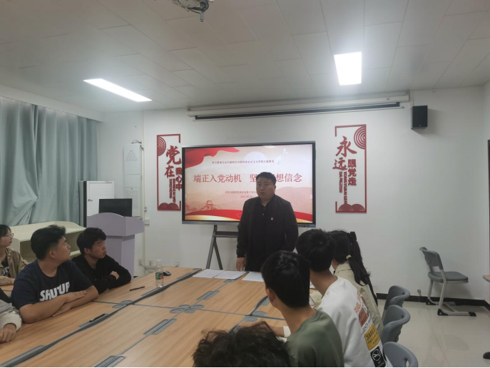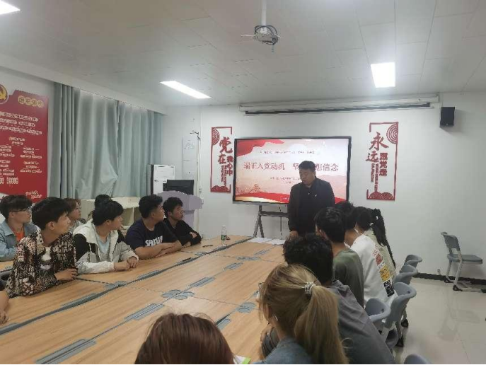 为学习贯彻习近平新时代中国特色社会主义思想及党的二十大精神,进一步加深广大师生对党的性质、纲领、任务、奋斗目标及党员权利和义务的认识与理解,端正入党动机,坚定理想信念,加强对公司师生的培训和教育,提高其思想政治素质和理论水平,信息工程公司党总支教工党支部于2023年5月8日,在郑州校区A514举行“端正入党动机 坚定理想信念”专题党课,教工党支部书记王雷为本次党课主讲人,2022级部分入党积极分子共50余人参加此次党课学习。
