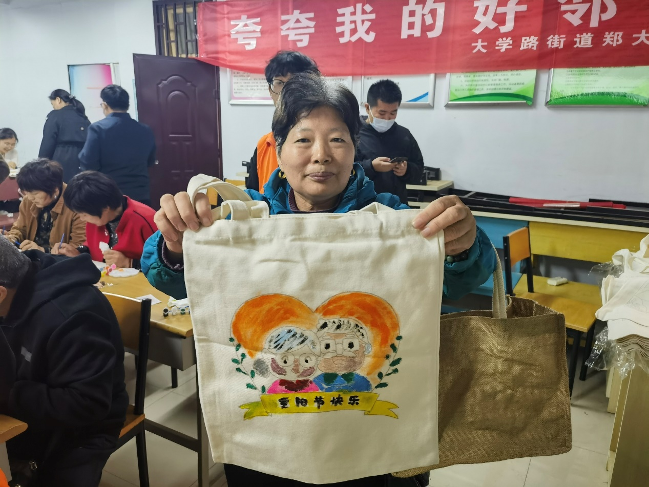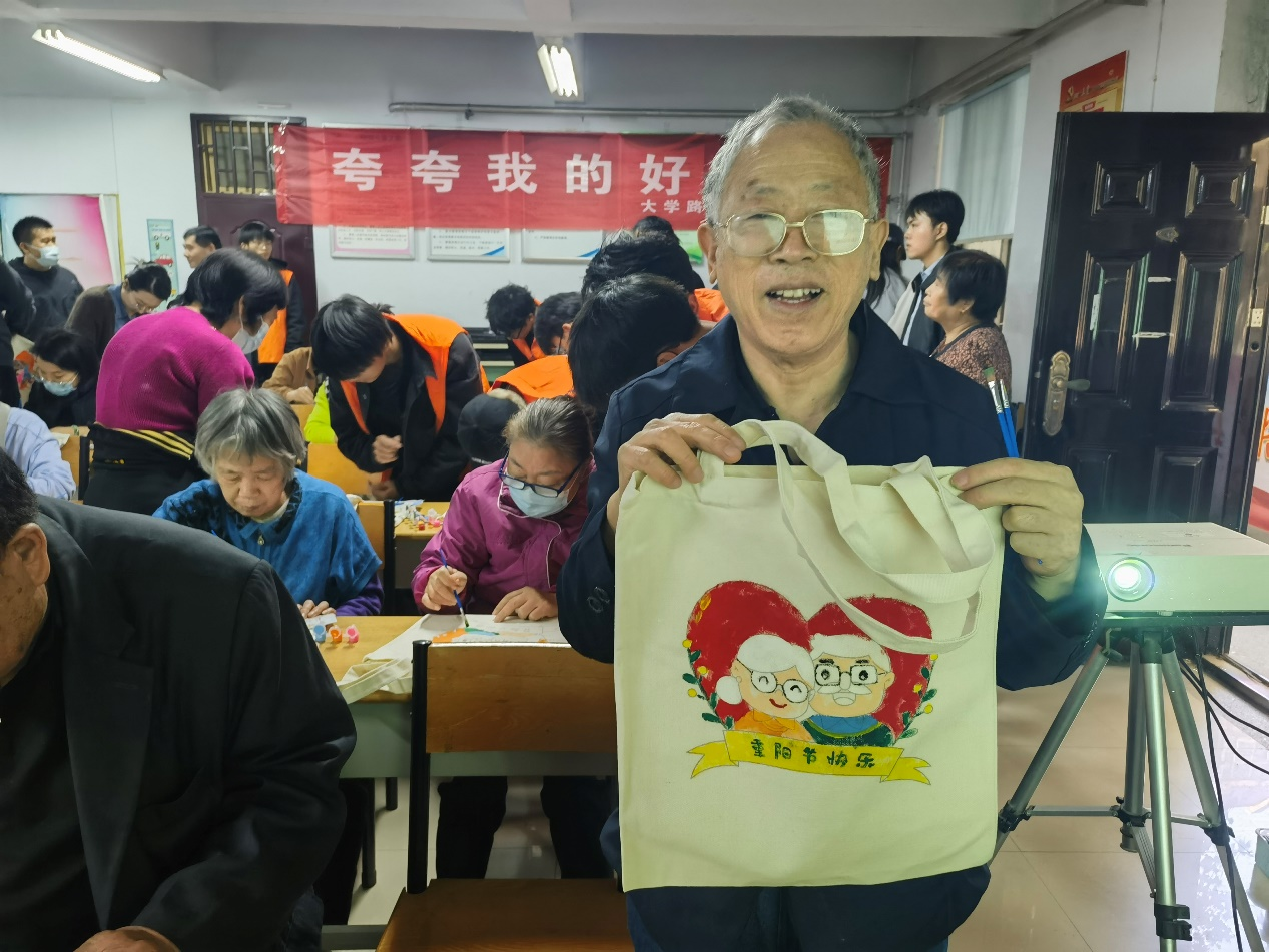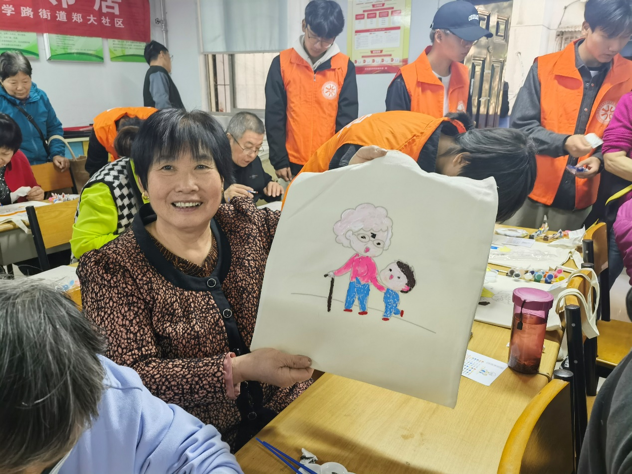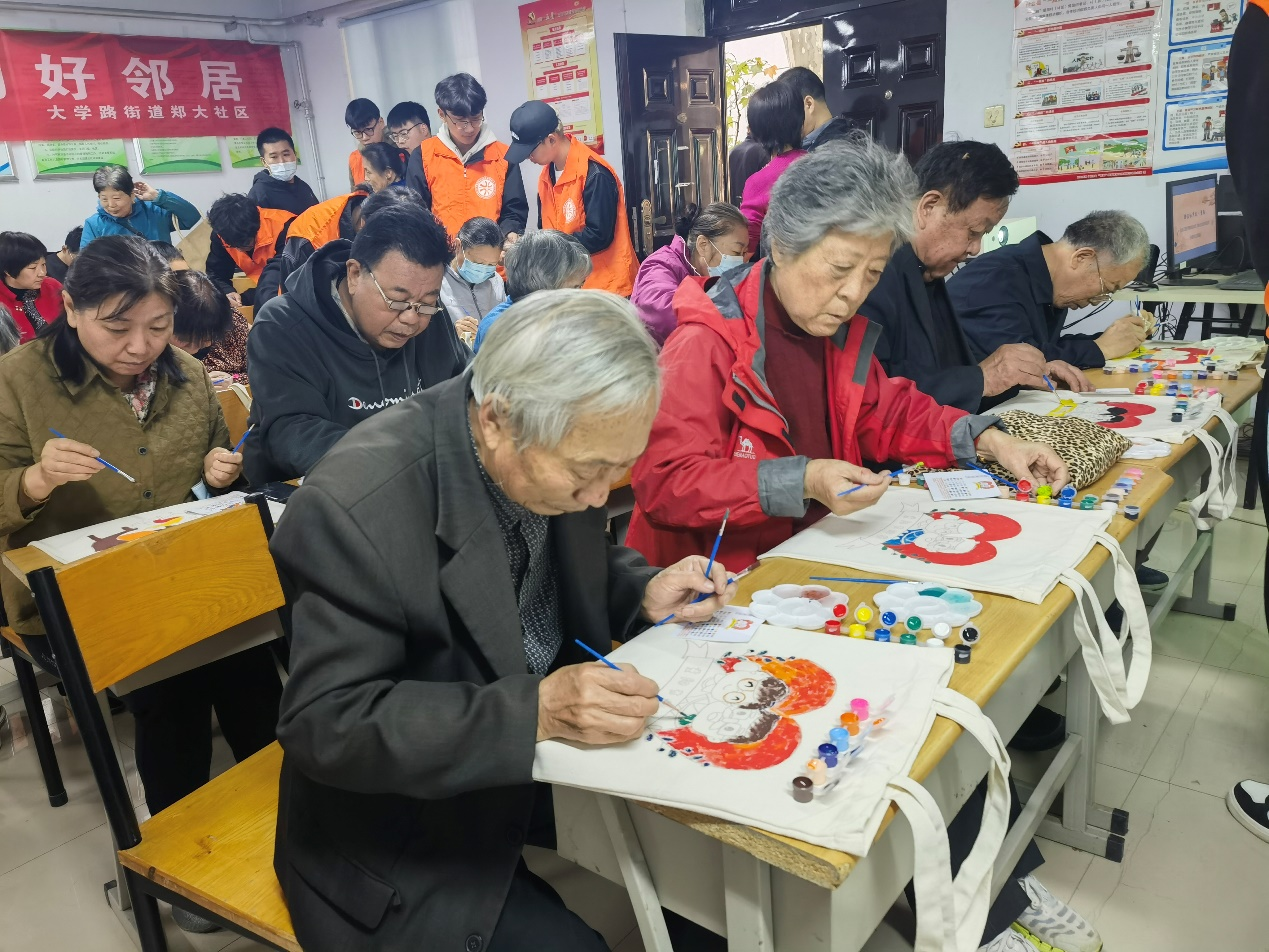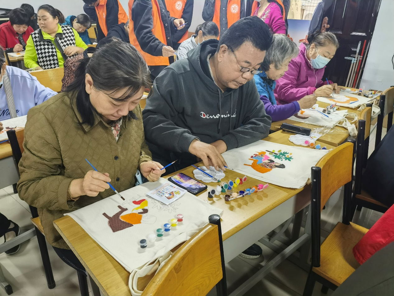 活动中,老人们选好自己喜欢的图案开始绘制布袋,根据布袋上的中图案进行填色创作。老人们聚精会神,相互交流绘画技巧,充分展现了新时代老年人热爱生活、积极乐观的精神风貌。党员教师和员工入党积极分子帮助老人们选颜色、调颜色、洗笔刷、讲技法,在帆布包上涂鸦创作,不仅传递了社会对老年人的温暖与关怀,还展示着职教师生的综合素养,现场气氛一派祥和。