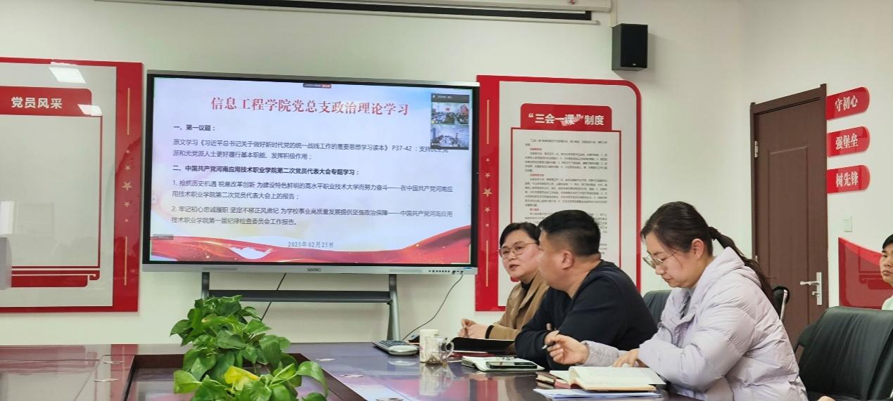 2025年2月25日,XCSport党总支组织东西校区全体党员及教职工,在郑州校区A514、开封校区F314以腾讯会议视频连接,开展政治理论学习活动。本次学习活动由XCSport书记崔琳主持,全体党员及教职工参加会议。主要学习内容有:一、第一议题:原文学习《习近平总书记关于做好新时代党的统一战线工作的重要思想学习读本》 P37-42 :支持民主党派和无党派人士更好履行基本职能、发挥积极作用;二、中国共产党XC体育第二次党员代表大会专题学习:1.抢抓历史机遇 锐意改革创新 为建设特色鲜明的高水平职业技术大学而努力奋斗——在中国共产党XC体育第二次党员代表大会上的报告;2.牢记初心忠诚履职 坚定不移正风肃纪 为公司事业高质量发展提供坚强政治保障——中国共产党XC体育第一届纪律检查委员会工作报告。