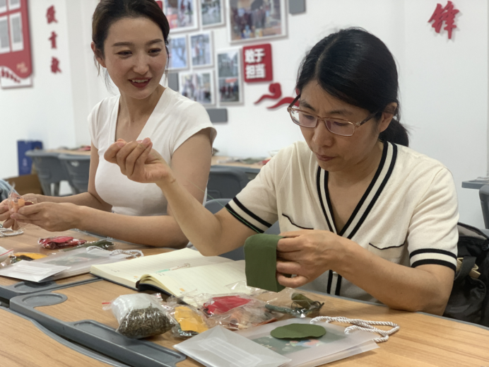 活动现场,崔琳书记为大家详细讲解了香囊的原料、功效以及制作方法,大家兴致盎然,认真观看香囊制作的视频教程。随后,大家有条不紊地按照说明步骤缝制香包,从穿针引线到填充香料再到钉扣收尾,现场气氛和谐融洽,大家都想把最美好、最真切的祝福缝进香囊里。