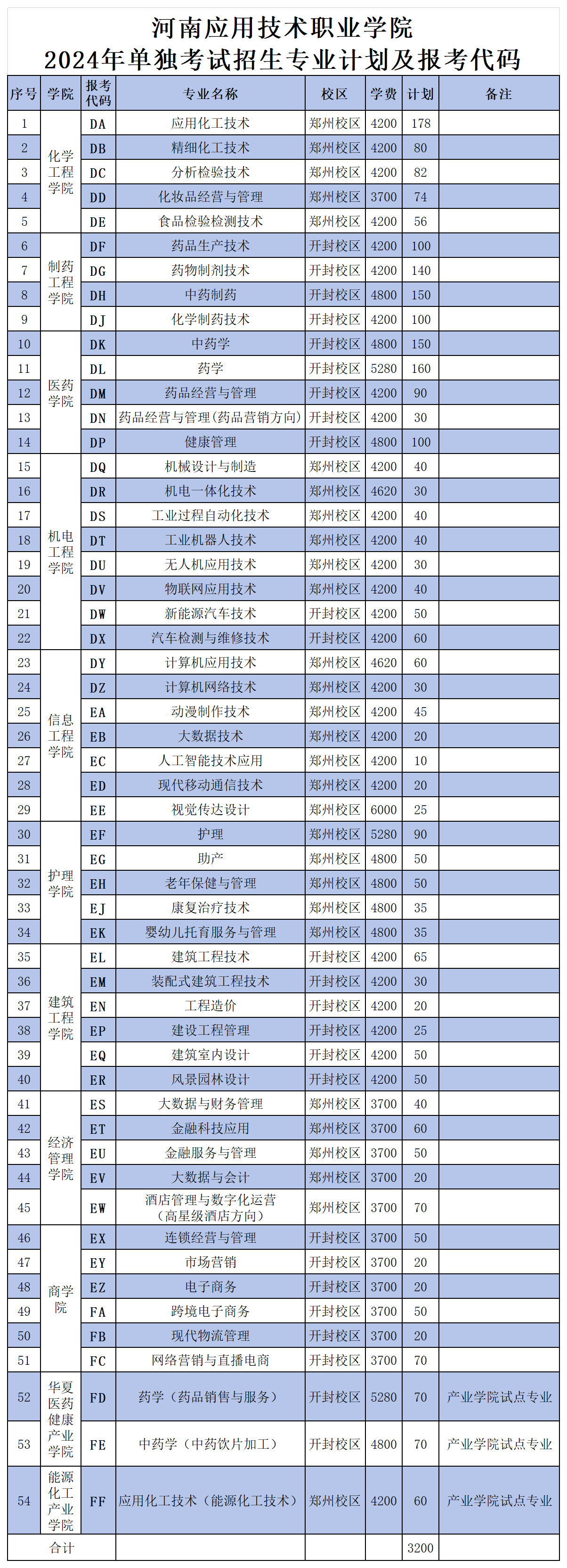 郑州校区:应用化工技术、精细化工技术、分析检验技术、化妆品经营与管理、食品检验检测技术、机械设计与制造、机电一体化技术、工业过程自动化技术、工业机器人技术、无人机应用技术、物联网应用技术、计算机应用技术、计算机网络技术、动漫制作技术、大数据技术、人工智能技术应用、现代移动通信技术、视觉传达设计、护理、助产、老年保健与管理、康复治疗技术、婴幼儿托育服务与管理、大数据与财务管理、金融科技应用、金融服务与管理、大数据与会计、酒店管理与数字化运营(高星级酒店方向)、应用化工技术(能源化工技术方向)。