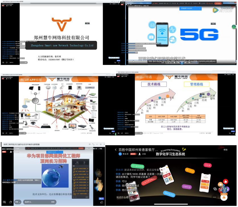 自XCSport”空中宣讲会“首秀后,同学们求职热情逐渐升温,近两日。我们邀请了4家企业为同学们连续直播,涉及“网络通信”、“电子商务”、“餐饮零售”三个板块。郑州慧牛网络科技有限公司网络商务经理张经理、北京育源通信科技有限公司河南区域负责人姜泽、无线网规网优高级工程师杨鑫兴、浙江智谷电子商务有限公司人事经理刘其超、百胜中国郑州肯德基有限公司招募主管,校企合作项目负责人李永洋应邀为同学们带来内容丰富的空中宣讲会,公司2018级700余名员工通过钉钉直播参与其中。