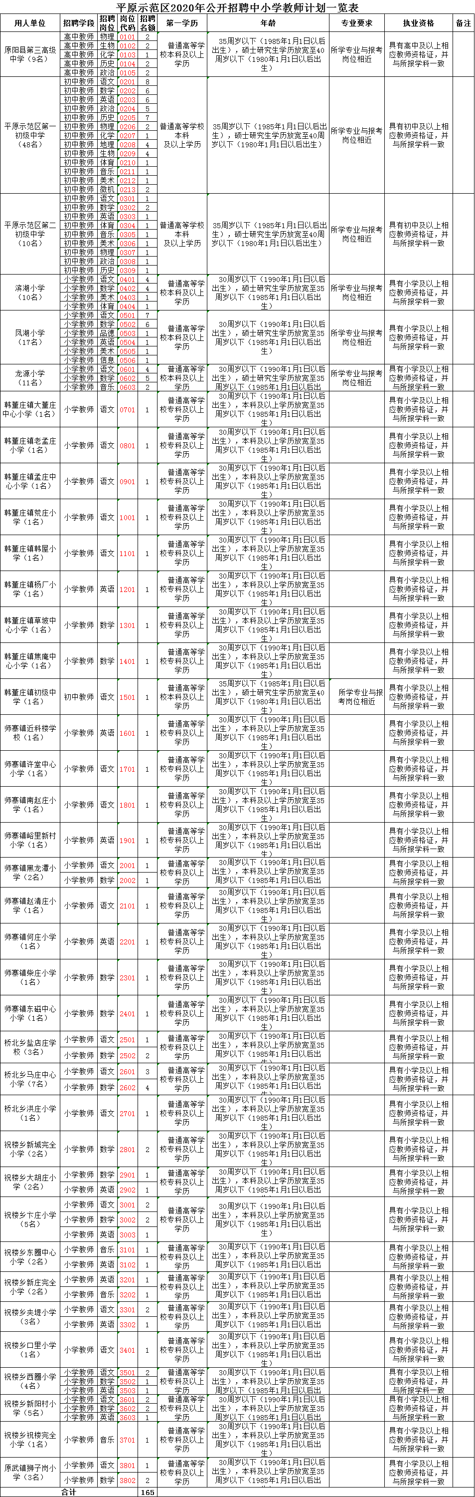 本次共招聘中小学教师165名。具体招聘计划及要求见《平原示范区2020年公开招聘教师计划一览表》(附件)。