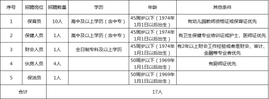 本次计划招聘区属幼儿园教职工17名,具体招聘岗位、人数及相关要求见《经开区区属幼儿园2019年公开招聘教职工岗位一览表》。
