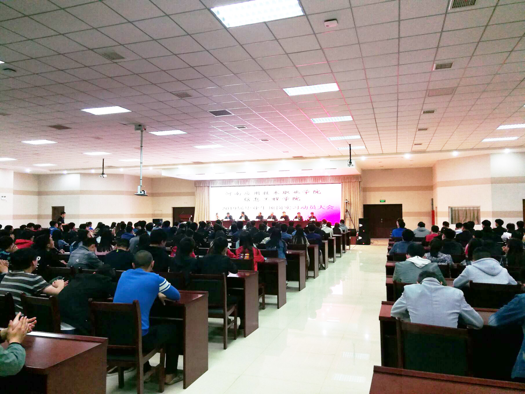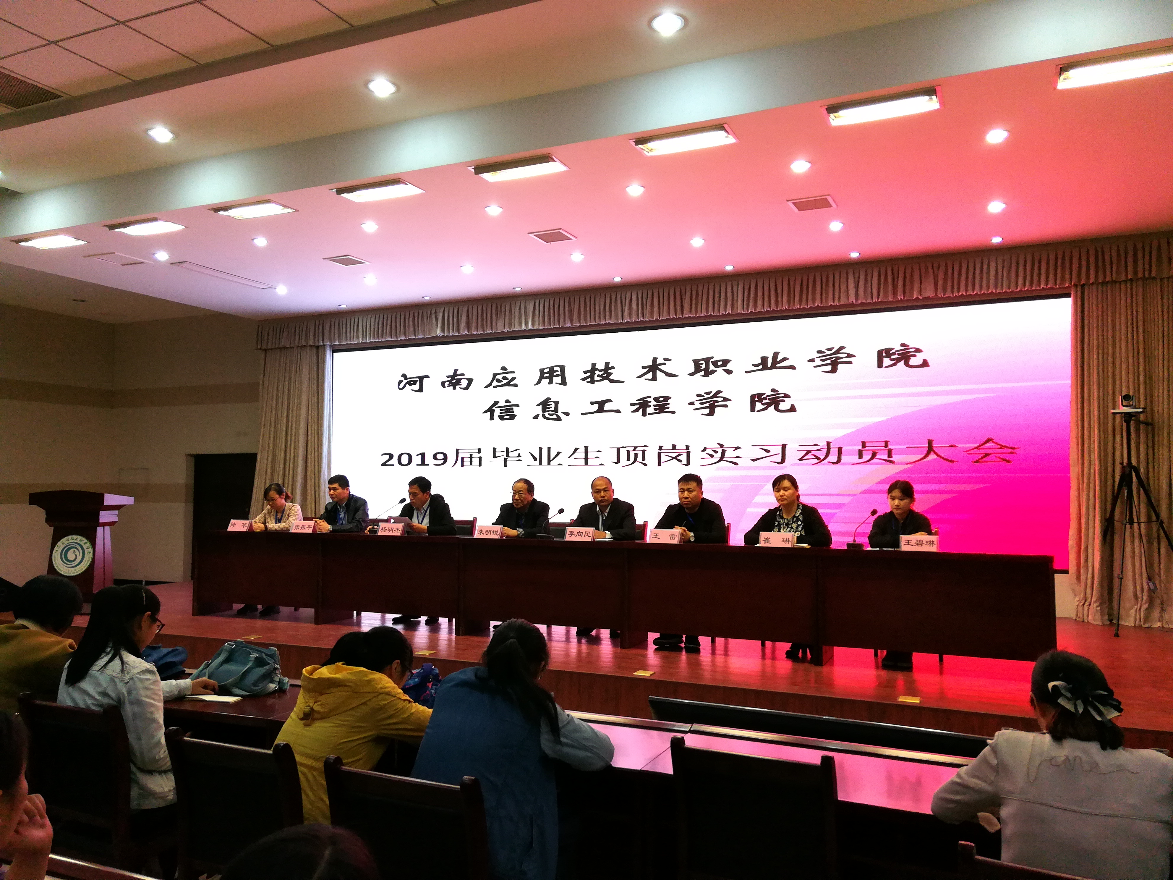 4月25日下午五点三十分,XCSport19届毕业生顶岗实习动员大会在实训楼二楼会议室顺利召开。参加本次会议的有XCSport经理王雷、副经理崔琳、XCSport党总支书记杨明杰、教务处处长朱明悦、就业创业指导中心主任李向民、计算机网络教研室主任张振平、艺术教研室主任降华等全体XCSport教师及2019届全体毕业生。