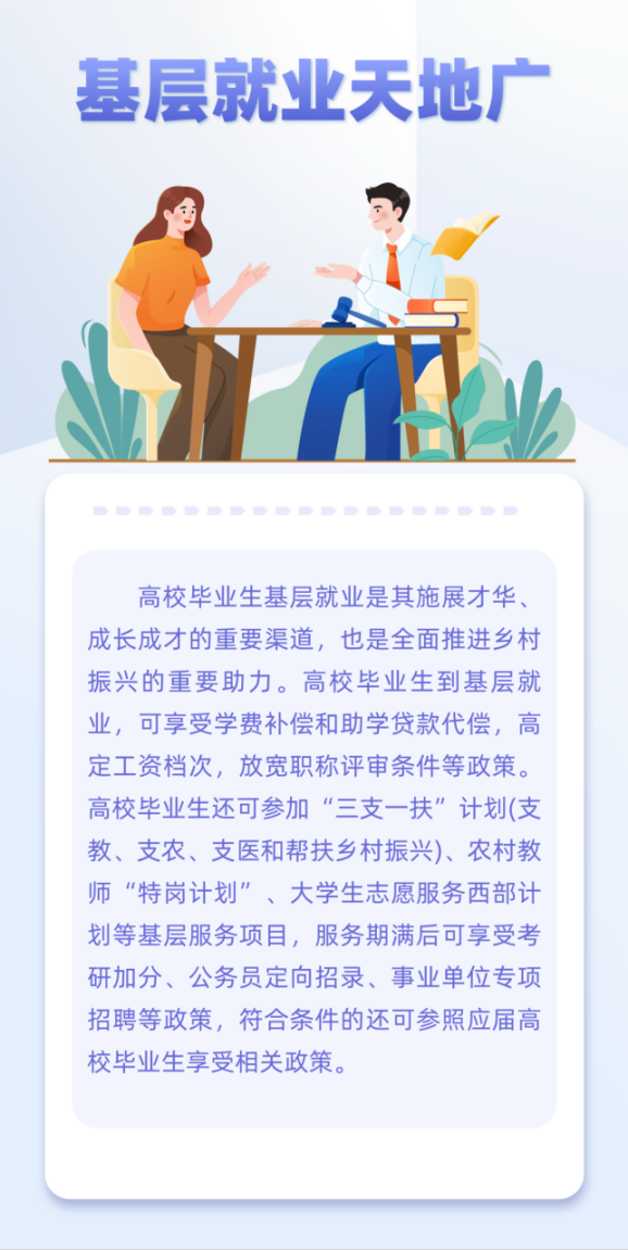 基层就业包含中央和地方的“三支一扶”计划(支教、支农、支医和帮扶乡村振兴)、老员工志愿服务西部计划、老员工村官、农村教师“特岗计划”,以及地方的选调生、乡村医生、乡村教师、农技特岗。