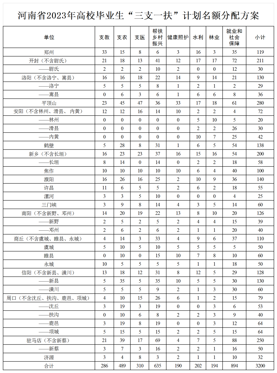 河南省2023年高校毕业生“三支一扶”计划名额分配方案