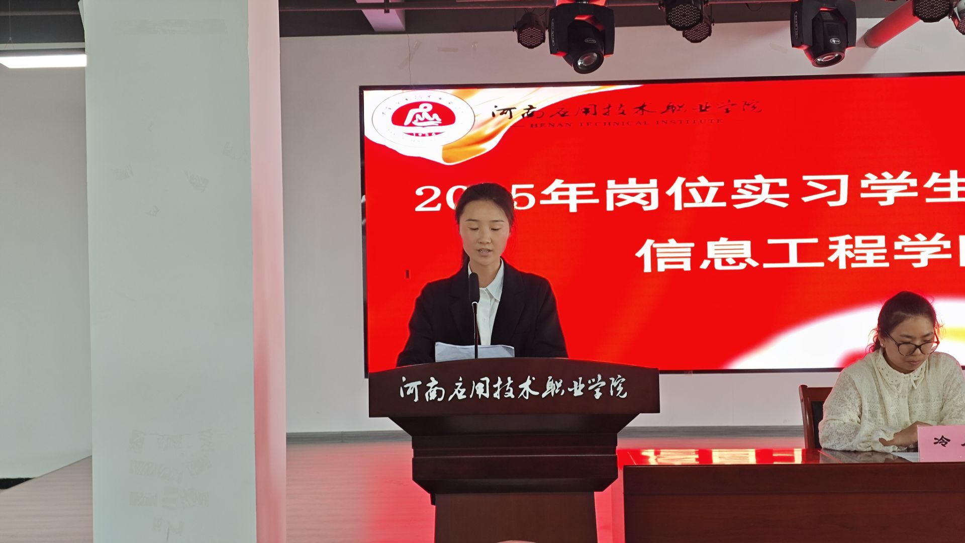 崔琳作动员讲话,通过对往届毕业生精彩的岗位实习经历的分享,鼓励同学们珍惜实习机会,勇敢面对挑战,为未来的职业发展打下坚实的基础。她强调,实习是公司教学的重要一环,同学们要认清实习期间的双重角色,端正态度、遵守规章制度、服从单位管理,在实习岗位上练就过硬本领。
