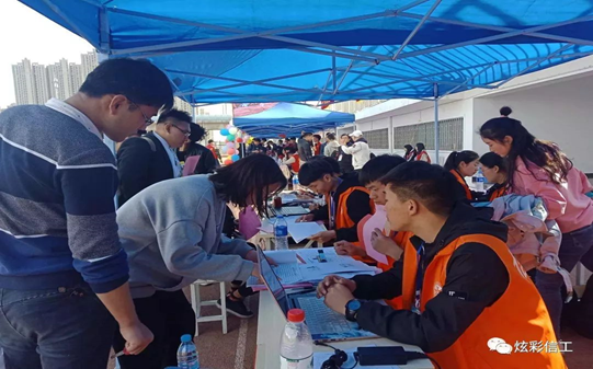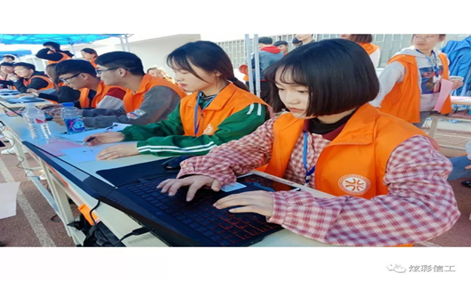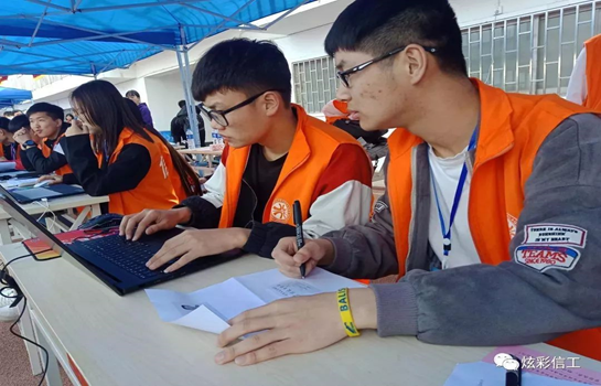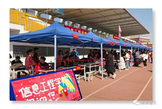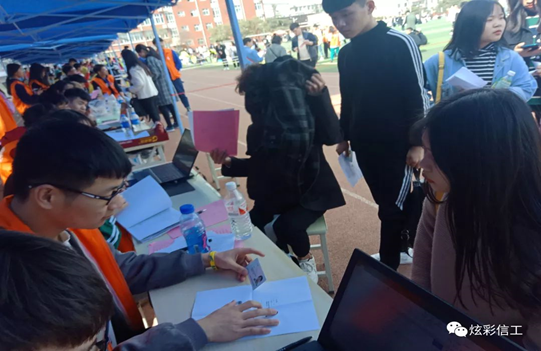 在三月三十日早晨7:00,信息工程团学会已经在操场主席台南边搭好帐篷在等待可爱的小学弟小学妹们报到!有的给学弟学妹统计信息,有的给他们指引考场以及参观公司,也有一部分人在布置考场。总而言之,所有在场的工作人员都各职其责。