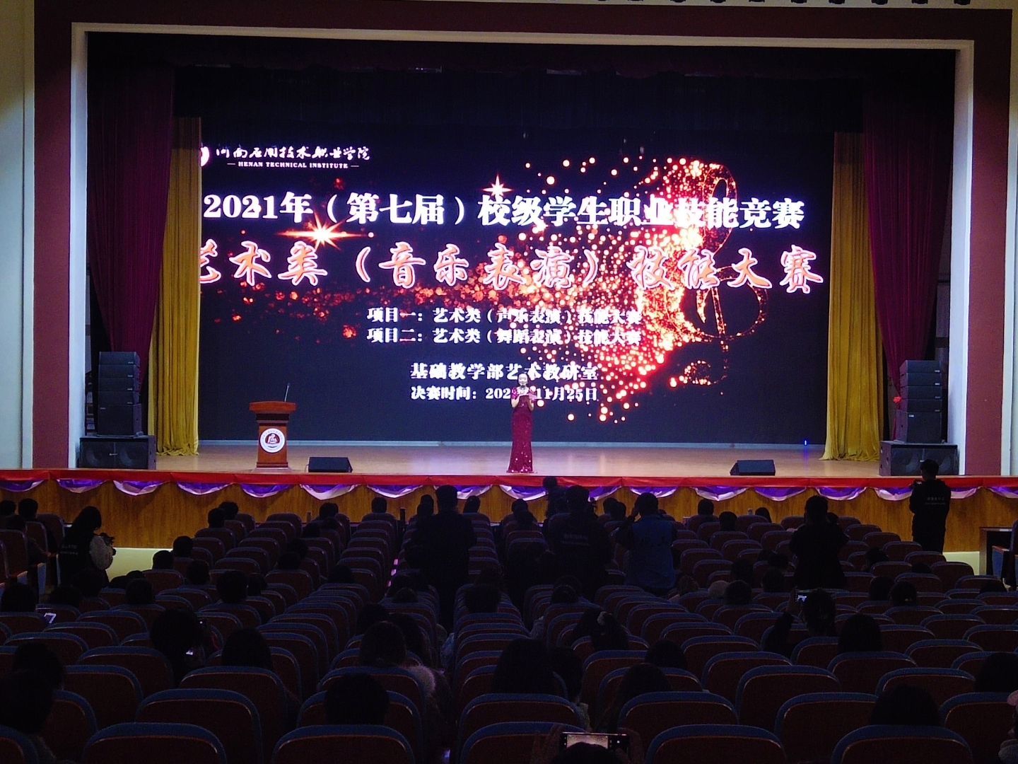 为营造积极向上、健康文明的校园文化气氛,全面提高员工自我表现力、审美力和创造力,为员工提供展示自己才华的舞台。2021年11月25日下午5时,XCSport赵欣同学在大礼堂参加第七届校员工职业技能竞赛艺术类(音乐表演)技能大赛。
