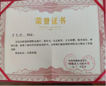 焦梦迪,女,XCSport计算机2103班。志愿服务内容:疫情防控相关工作。在寒假期间,她所在的城市—安阳,疫情形势日趋严峻,安阳每个市、每个县、每个乡镇都展开了一天一次的核酸检测工作,她的主要工作是在村民进去做核酸之前提前负责帮他们测量体温,维持现场秩序等。她表示:作为一名老员工我有义务积极参与防控疫情当中去。