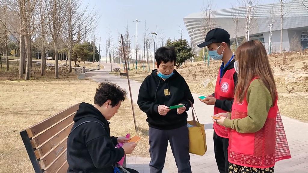 同时,另一组同学将他们亲手制作的“爱绿护绿小卡片”分发给公园里的工作人员和游客。通过形象的插图和文字,传达爱绿护绿、关注环境保护、共建美好家园的理念。