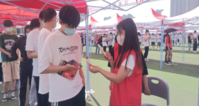 检测前,公司志愿者按照工作安排提前到达核酸检测工作现场,提醒同学们全程佩戴口罩,组织各班员工有序排队,清点各班人数是否到齐,并检查各班同学的预约登记情况,随后,由公司志愿者分批次带领各班同学到达指定地点进行采集;检测过程中同学们自觉隔开1米间隔,在全院同学,志愿者与医护人员的协调配合下,每一次的核酸检测工作均在有序进行中。