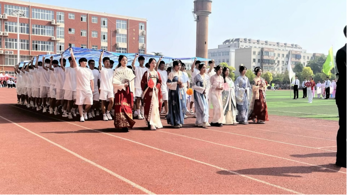 手举巨幅旗帜,迈着矫健的步伐,XCSport方块队走向主席台。旗帜上的国潮插画是XCSport师生共同设计绘制,是现代信息技术与艺术的融合。郑州二七纪念塔、中原福塔等建筑,寓意公司培养的高素质复合型人才服务于整个河南省;数据结构树、大数据祥云,既代表公司信息技术特色,也代表公司的员工遨游知识海洋、紧跟时代潮流。XCSport扎根河南服务河南,致力于培养具有追求卓越工匠精神、勇担时代重任的有为青年。