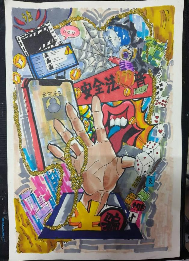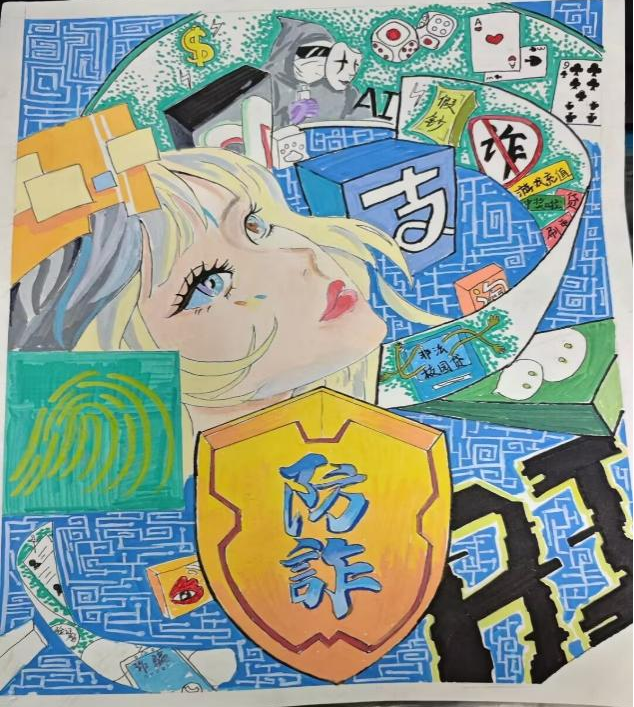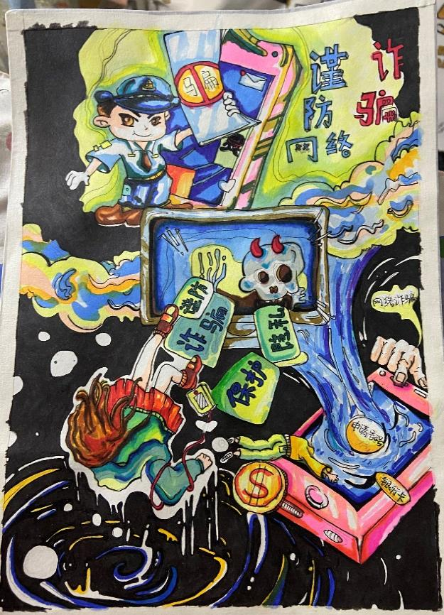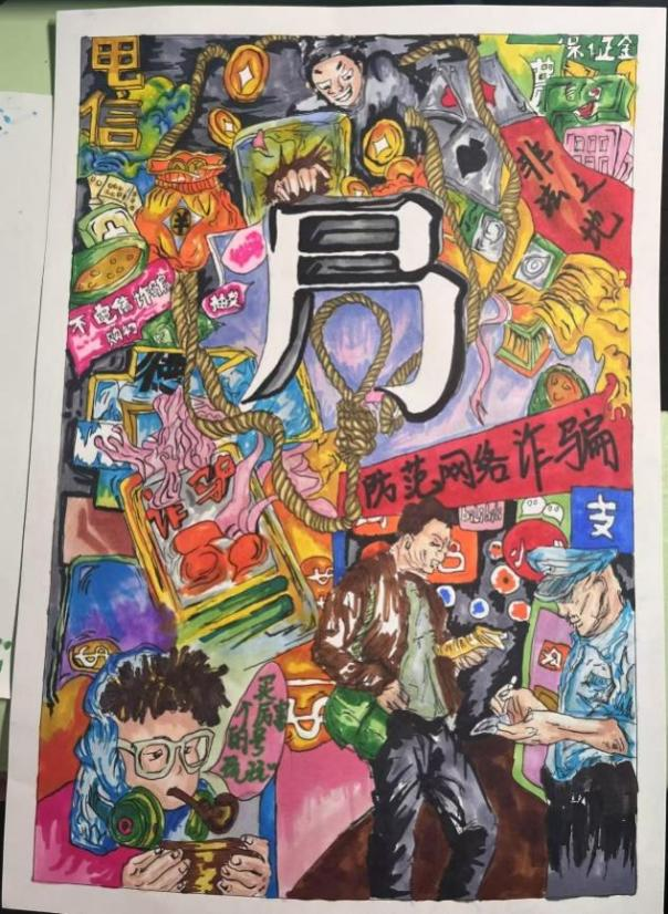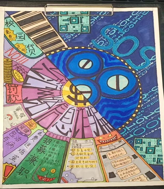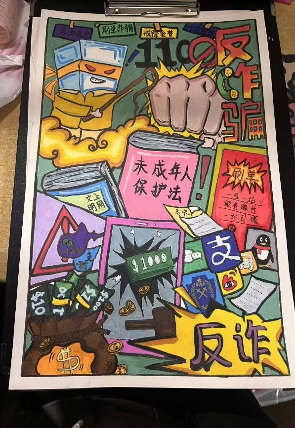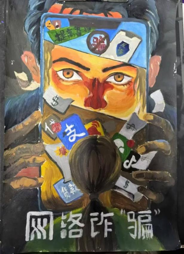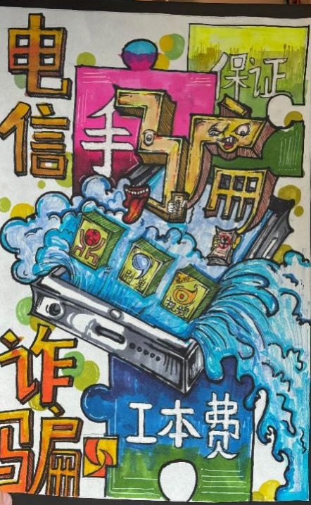开展反诈创意作品征集活动,自开展以来,引起师生广泛关注、员工踊跃参与,共收到百余幅海报作品,同学们通过各种角度绘制反诈故事、普及防骗知识,其作品创意十足,兼具艺术感染力与教育警示意义,进一步加深了同学们对反诈防线的深刻理解。