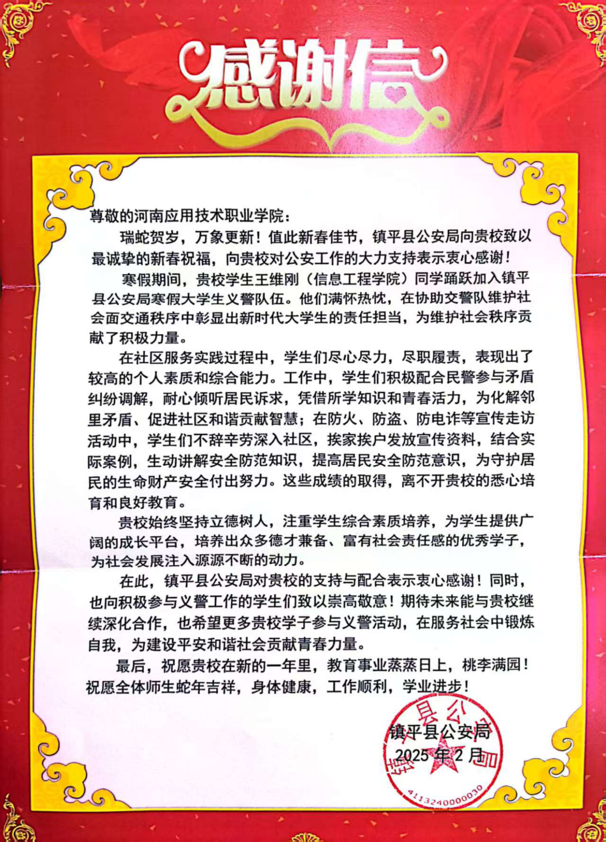 2月21日,XCSport收到来自河南省南阳市镇平县公安局的感谢信,信中表达了对公司员工王维刚寒假期间加入镇平县公安局寒假老员工义务警队,协助指挥交通、维护交通秩序的赞扬,也对公司育人成果表示感谢。