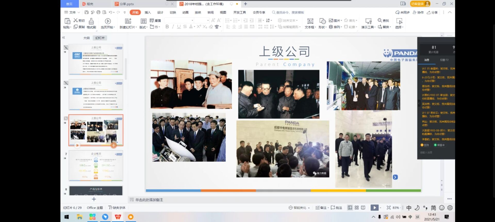 五家企业宣讲人分别为公司毕业生们带来了研发科技类、IT类、服务类、营销类、智造类、供应链类、管理类等多个类型的实习岗位,为毕业生们减轻了当代社会就业困难的压力,各位宣讲人通过在线PPT播放的形式从产品技术、职业平台、单位工作环境、工作内容、人才需求等多个层面让同学们及时掌握了各个用人单位招聘情况,其中郑州伊莱沙伯电子科技有限公司朱经理以云面对面这种特殊的方式向同学们叙述了该公司的招聘内容。