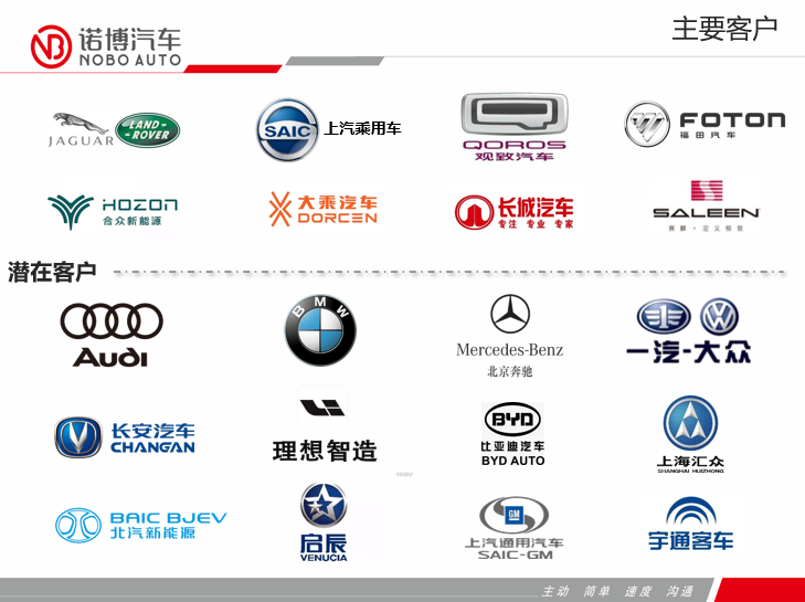诺博汽车系统有限公司主要生产汽车座椅、内外饰、橡胶三大系统产品,地处京津冀核心区,,具备独立自主的研发能力,具备汽车软硬质仪表板、门板、顶棚、地毯等内饰产品的开发设计能力,通过先进的设备和工艺保证生产工程的稳定性和产品的可靠性,其公司有四大生产基地,未来将继续增设四个生产基地。