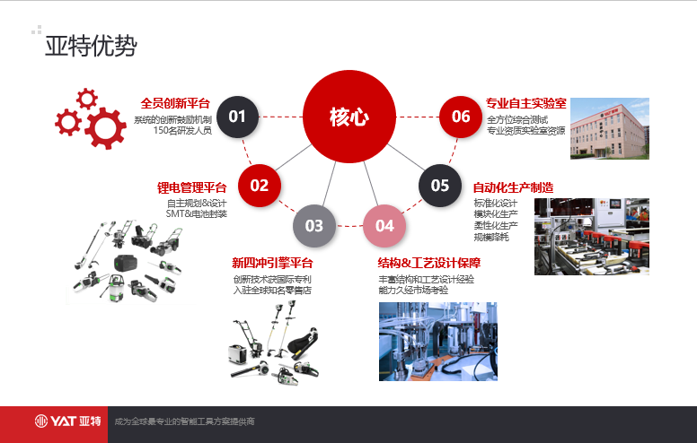 浙江亚特电器有限公司成立于2002年,是一家以园林器械、电动工具和智能产品为主的现代化制造型企业,该企业运用中西结合的方式将人文关怀的理念注入到企业管理中,成立第一年公司就取得了ISO证书,2003年开始生产电链锯并获得国内第一张TUV莱茵GS/EMC证书,公司愿景是成为全球最专业的智能工具方案提供商。