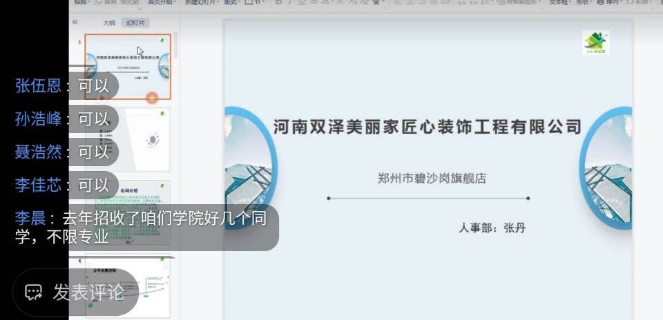 为促进用人单位做好校园招聘活动,给单位与毕业生双向选择创造便利条件,公司XCSport2022届毕业生“空中宣讲会”仍在继续进行。于5月26至5月27日有三家公司的宣讲人继续通过钉钉直播的方式为公司顶岗实习的毕业生们进行企业宣讲,他们分别是河南双泽美丽家匠心装饰工程有限公司招聘经理张丹、CBC信用管理有限公司河南分公司招聘经理许彦、河南博才信息技术有限公司招聘经理申举玮。
