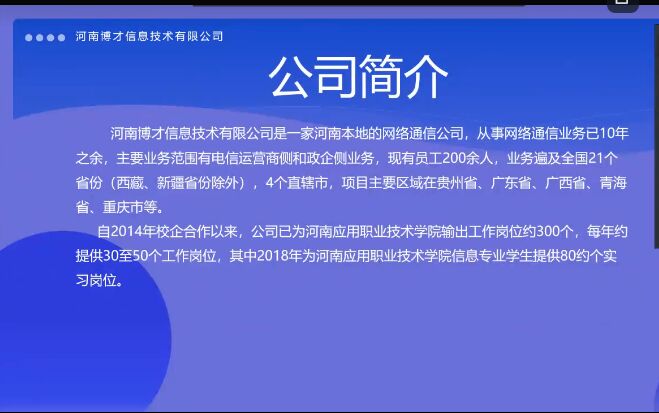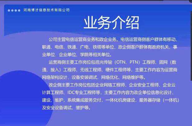 河南博才信息技术有限公司,公司主要从事电信运营商和企业网信息化建设。运营商侧网络设计、设备安装调试、网络优化、网络维护等,涉及产品线主要有光网络、无线接入、有线接入(数通、接入)。企业网整体信息化设计、一体化机房建设、网络维护及系统集成业务交付,以及信息化相关产品销售(防火墙、路由器、交换机、服务器、存储、一体机等)。