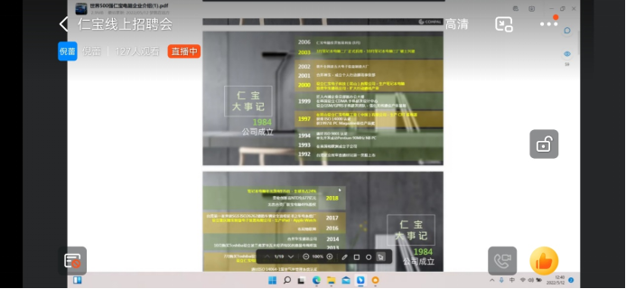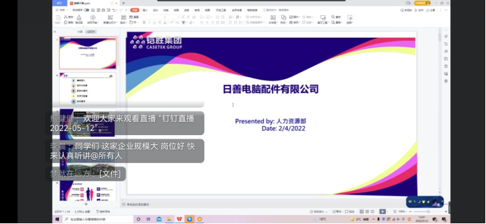 为持续给公司2023届毕业生提供多元化精准服务,搭建起企业和员工之间便捷的沟通桥梁,有效促进员工就业,2022年5月12日,XCSport邀请仁宝电子科技(昆山)有限公司招聘经理倪蕾、日善电脑配件(嘉善)有限公司招聘经理熊健健、河南今日通信科技有限公司人力资源部负责人李欣亮三家企业的招聘经理通过钉钉直播的方式为大家进行宣讲。