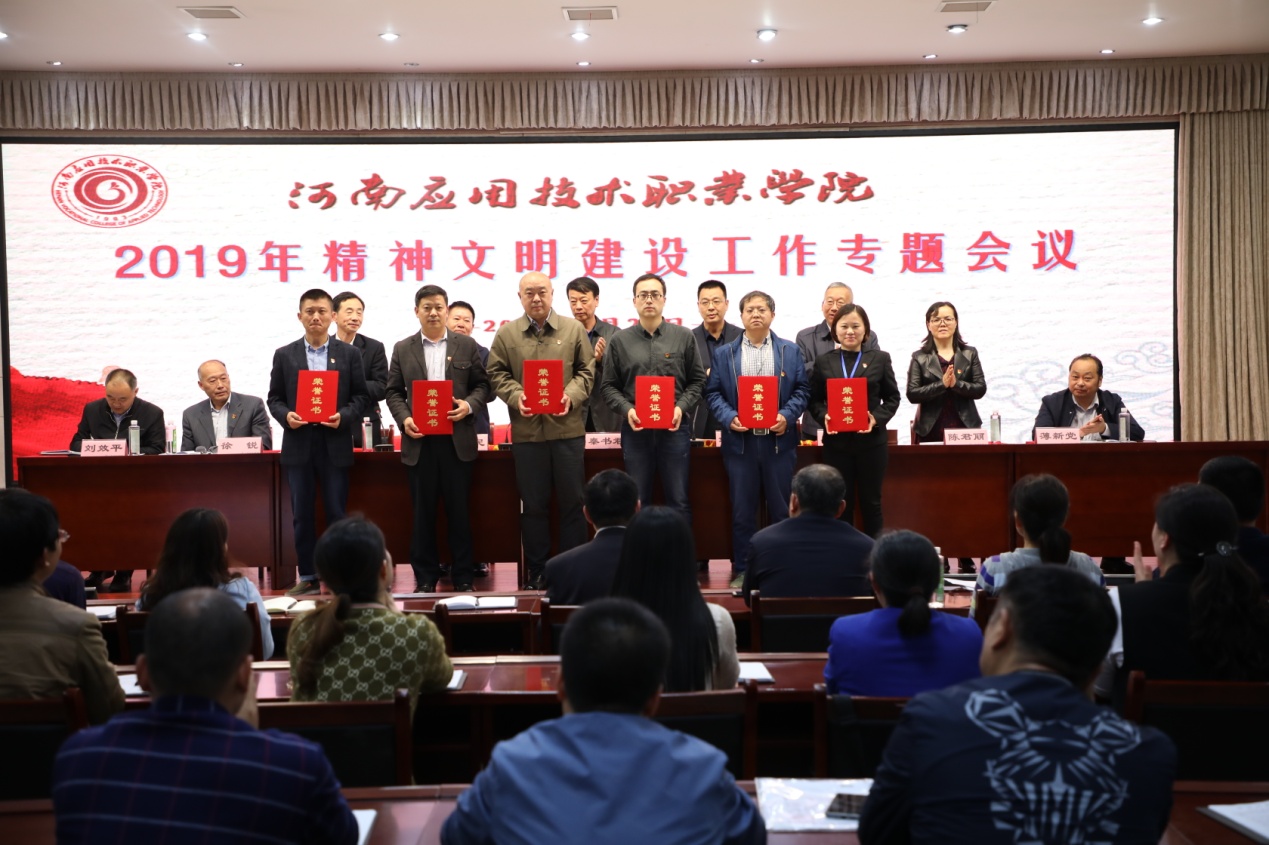 会上,副董事长赵玉奇代表公司党委宣读了《关于表彰2018年度“文明处室(院部)”、“文明教研室”、“文明食堂”、“文明职工”的决定》,2018年公司共表彰文明处室(院部)8个,文明教研室13个,文明食堂6个,文明职工36人。校领导为受表彰集体进行了颁奖。